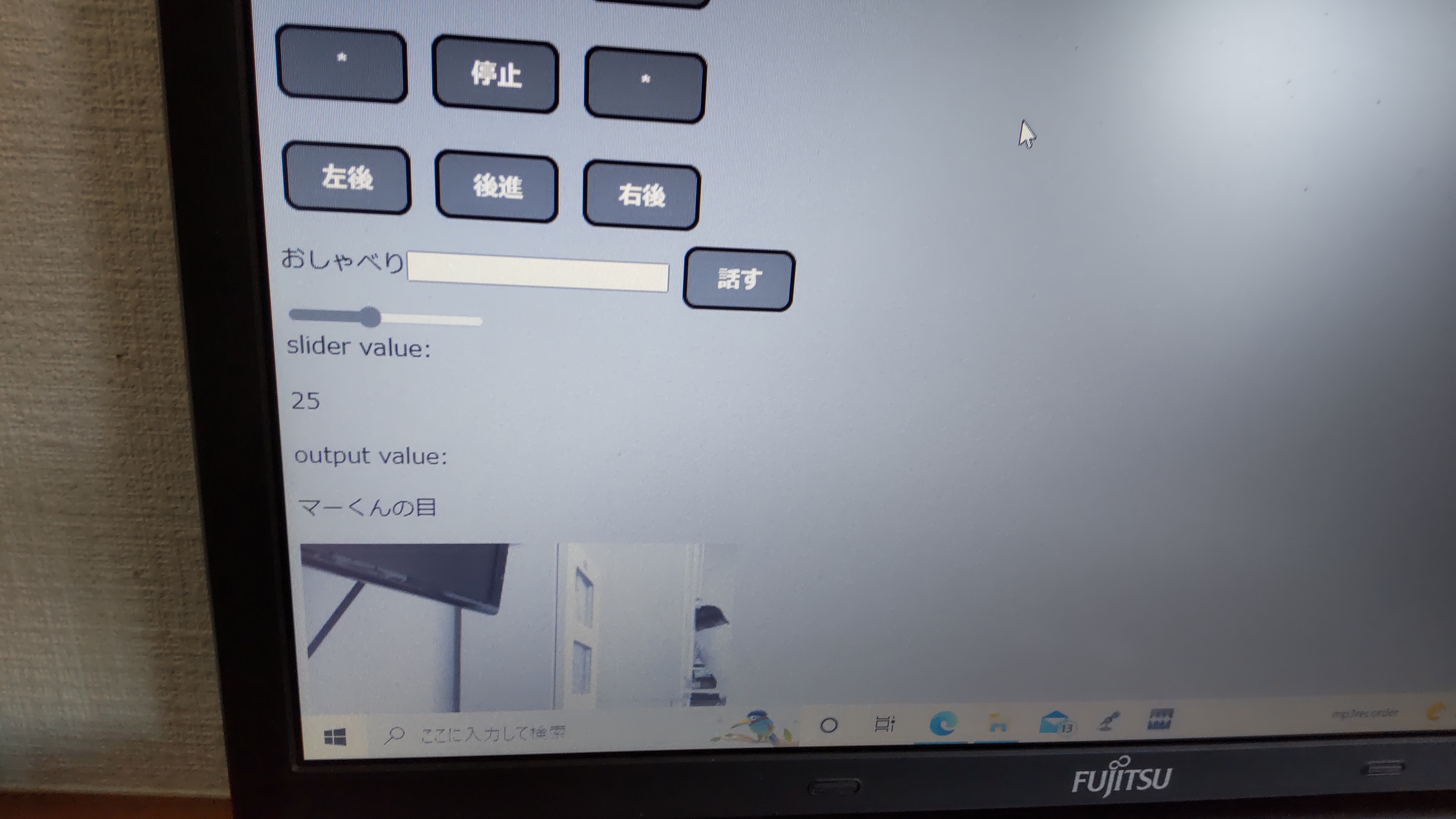 マーくんコントローラー<body> <p>ボタンを押すとマーくんが動くよ!</p> <button id="left_forward" type="button" onClick="left_forward()">左前</button> <button id="forward" type="button" onClick="forward()">前進</button> <button id="right_forward" type="button" onClick="right_forward()">右前</button> <p> <button type="button">*</button> <button id="stop" type="button" onClick="stop()">停止</button> <button type="button">*</button> </p> <button id="left_back" type="button" onClick="left_back() ">左後</button> <button id="back" type="button" onClick="back()">後進</button> <button id="right_back" type="button" onClick="right_back() ">右後</button> <div id="speak"> おしゃべり<input type="text" id="word"/> </div> <div class="slidecontainer"> <input type="range" min="15" max="40" value="25" class="slider" id="myRange"> </div> </td> </tr> <tr> <td>slider value:<p id="out"></p></td> <td>output value:<p id="out2"></p></td> </tr> </tbody> </table> </td> </tr> </table> </div> <script> var division = 20; var commandID = 0; var slider = document.getElementById("myRange"); var output = document.getElementById("out"); var output2 = document.getElementById("out2"); output.innerHTML = slider.value; // Display the default slider value // Update the current slider value (each time you drag the slider handle) slider.oninput = function(){ output.innerHTML = slider.value; output2.innerHTML = slider.value/division; var outvalue = slider.value/division; webiopi().callMacro("setHwPWMforPan", outvalue); }; </script> </div> <p>マーくんの目</p> <img src="http://rasrobo.local:8080/?action=stream" /> <script type="text/javascript" src="/webiopi.js"></script> <script type="text/javascript" src="/jquery.js"></script> <script type="text/javascript"> var webiopi = webiopi(); webiopi.ready(function() { webiopi.refreshGPIO(true); webiopi.setFunction(8, "OUT"); webiopi.setFunction(7, "OUT"); webiopi.setFunction(23, "OUT"); webiopi.setFunction(24, "OUT"); webiopi.callMacro("jtalk",'どーもどーもマークンです');