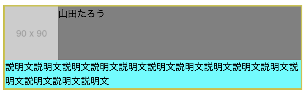 1 <div class="wrapper"> 2 <div class="flex"> 3 <img src="https://placehold.jp/90x90.png"> 4 <div class="test"> 5 <div>山田たろう</div> 6 <div class="desc">説明文説明文説明文説明文説明文説明文説明文説明文説明文説明文説明文説明文説明文説明文</div> 7 </div> 8 </div> 9 </div>