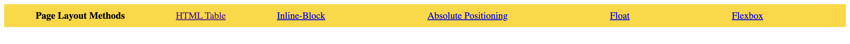 1<div class="container"> 2 <div> 3 <p>Page Layout Methods</p> 4 <li><a href="./html-table.html">HTML Table</a></li> 5 <li><a href="./inline-block.html">Inline-Block</li> 6 <li><a href="./absolute-position.html">Absolute Positioning</li> 7 <li><a href="./float.html">Float</li> 8 <li><a href="./flex.html">Flexbox</li> 9</div>