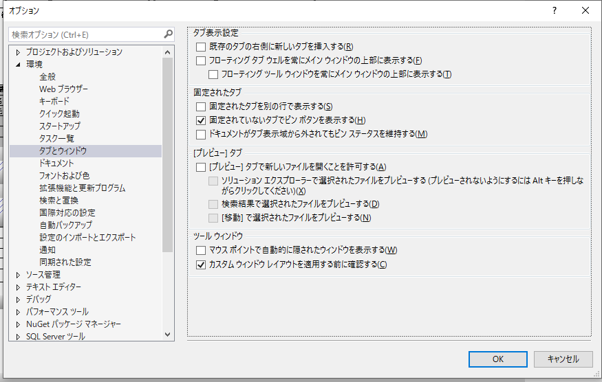添付写真のツール→オプション→環境→タブとウィンドウの設定を見た際に、そういった設定項目は見当たりませんでした。