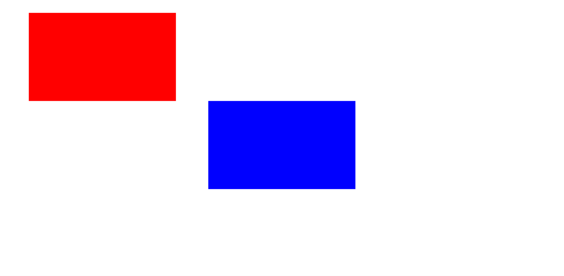 1#box1 {2 width: 500px;3 height: 300px;4 background-color: #f00;5 margin: 50px 0 0 50px ;6 padding: 30px;7 position: relative;8}9 10#box2 {11 width: 500px;12 height: 300px;13 background-color: #00f;14 margin: 0 auto;15 padding: 50px;16 position: fixed;17 top: 350px;18 left: 650px;19}