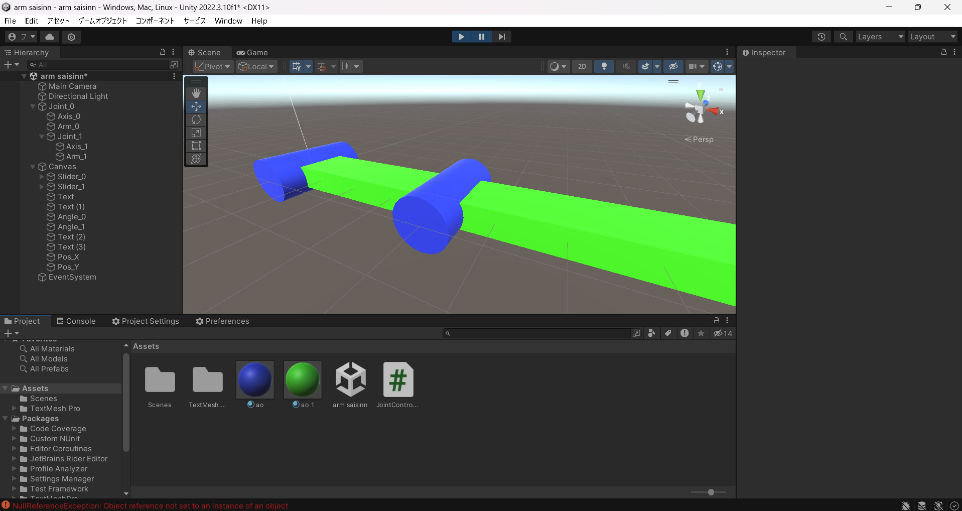 1"Object reference not set to an instance of an object" 2 3 4### 該当のソースコード 5 6```C# 7using System.Collections; 8using System.Collections.Generic; 9using UnityEngine; 10using UnityEngine.UI; 11 12namespace InverseKinematics 13{ 14 public class JointController : MonoBehaviour 15 { 16 //robot 17 private GameObject[] Joint = new GameObject[2]; 18 private GameObject[] Arm = new GameObject[2]; 19 private float[] armL = new float[2]; 20 private Vector3[] angle = new Vector3[2]; 21 22 //UI 23 private Slider[] slider = new Slider[2]; 24 private Text[] angText = new Text[2]; 25 private Text[] posText = new Text[2]; 26 27 void Start() 28 { 29 //robot 30 for (int i = 0; i < Joint.Length; i++) 31 { 32 Joint[i] = GameObject.Find("Joint_" + i.ToString()); 33 Arm[i] = GameObject.Find("Arm_" + i.ToString()); 34 armL[i] = Arm[i].transform.localScale.x; 35 } 36 37 for (int i = 0; i < Joint.Length; i++) 38 { 39 slider[i] = GameObject.Find("Slider_" + i.ToString()).GetComponent<Slider>(); 40 angText[i] = GameObject.Find("Angle_" + i.ToString()).GetComponent<Text>(); 41 } 42 posText[0] = GameObject.Find("Pos_X").GetComponent<Text>(); 43 posText[1] = GameObject.Find("Pos_Y").GetComponent<Text>(); 44 45 } 46 47 void Update() 48 { 49 for (int i = 0; i < Joint.Length; i++) 50 { 51 angText[i].text = slider[i].value.ToString("f2"); 52 angle[i].z = slider[i].value; 53 Joint[i].transform.localEulerAngles = angle[i]; 54 } 55 56 float px = armL[0] * Mathf.Cos(angle[0].z * Mathf.Deg2Rad) + armL[1] * Mathf.Cos((angle[0].z + angle[1].z) * Mathf.Deg2Rad); 57 float py = armL[0] * Mathf.Sin(angle[0].z * Mathf.Deg2Rad) + armL[1] * Mathf.Sin((angle[0].z + angle[1].z) * Mathf.Deg2Rad); 58 59 posText[0].text = px.ToString("f2"); 60 posText[1].text = py.ToString("f2"); 61 } 62 } 63}